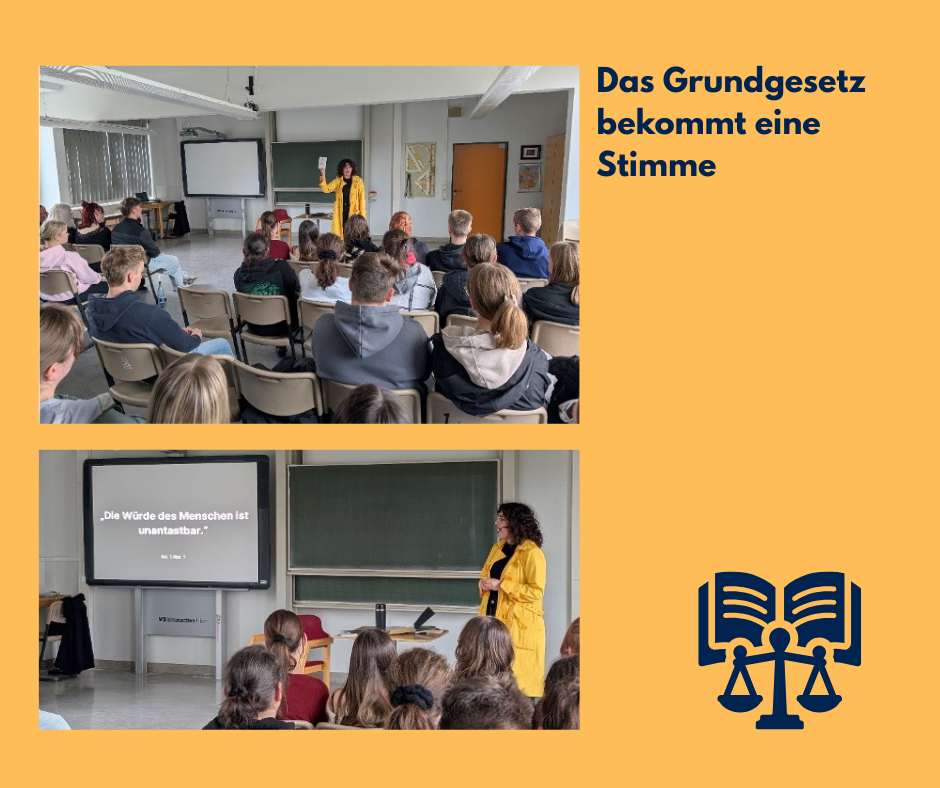 Am 28. Oktober 2025 sahen Azubis des ersten Ausbildungsjahres KFB und des zweiten Ausbildungsjahres VFA das Ein-Personen-Stück „Wir das Grundgesetz“. Lebendig, anschaulich und humorvoll erzählte die Verfassung, sehr professionell gespielt von der Schauspielerin Clarissa Schneider, von ihrer Geschichte, den Werten des Grundgesetzes und stellte aktuelle Bezüge her. Ein Thema von großer Bedeutung und Wichtigkeit wird so in ein gut durchdachtes, ausdrucksstarkes, kreatives, vielseitiges Konzept gepackt und regt garantiert zum Nachdenken und Diskutieren an. Das Stück ist eine Kooperation mit der Stiftung Orte der deutschen Demokratiegeschichte (gefördert von der Bundesbeauftragten für Kultur und Medien) und wurde von der Gesellschaft zur Erforschung der Demokratie-Geschichte e. V. mit Förderung der Thüringer Staatskanzlei und der Stiftung Orte der deutschen Demokratie-Geschichte entwickelt. (Text: I. Hoffmann)