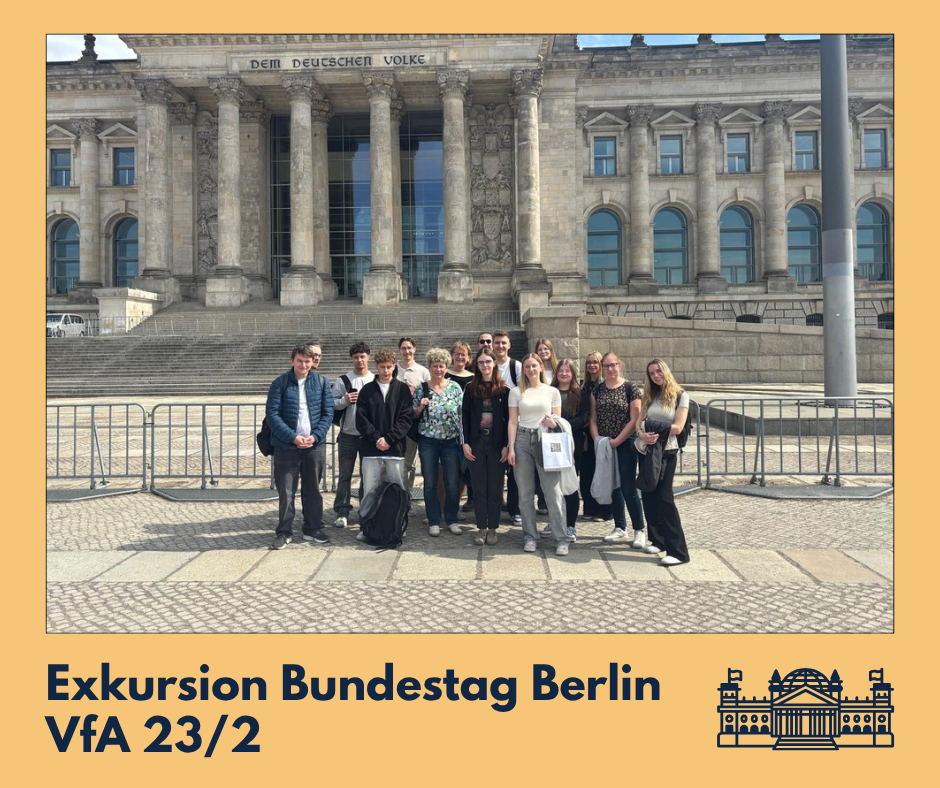 Wir, die Klasse VFA 23/2, unternahmen am 16. April einen spannenden Ausflug zum Deutschen Bundestag nach Berlin. Mit im Gepäck: Frau Hoffmann, Frau Hecker und gute Laune – bei sommerlichen 20 Grad und Sonnenschein. Bereits die Anreise war von großer Vorfreude geprägt, da viele von uns den Bundestag bislang nur aus dem Fernsehen kannten. Vor Ort angekommen, bekamen wir zunächst einen Einblick in die Bedeutung des Parlaments und seine zentrale Rolle in der deutschen Demokratie. Ein besonderes Highlight des Tages war die Teilnahme an einer Plenarsitzung. Von der Besuchertribüne aus konnten wir live verfolgen, wie politische Debatten geführt werden. Der Tagesordnungspunkt, den wir mitverfolgten, behandelte die Ergebnisse der Wahlen in Ungarn. Dabei äußerten sich Abgeordnete verschiedener Parteien zu den demokratischenEntwicklungen vor Ort und bewerteten die Situation aus unterschiedlichen politischen Perspektiven. Wie so oft waren sich die Abgeordneten dabei sehr uneinig. Im Anschluss hatten wir die Möglichkeit, mit dem Bundestagsabgeordneten Sören Pellmann(Die Linke), der den Wahlkreis Leipzig II vertritt, ins Gespräch zu kommen. In eineroffenen Fragerunde konnten wir ihm zahlreiche Fragen stellen. Dabei ging es unter anderem um seinen politischen Alltag und aktuelle weltpolitische Themen. Der Austausch war für viele von uns besonders wertvoll, da wir Politik einmal aus nächster Nähe erleben konnten. Insgesamt war der Ausflug sehr informativ und hat uns gezeigt, wie wichtig politische Beteiligung und Meinungsbildung sind. Der Tag im Bundestag wird uns daher sicherlich noch lange in Erinnerung bleiben. Schülerbericht: Felix, VFA 23/2